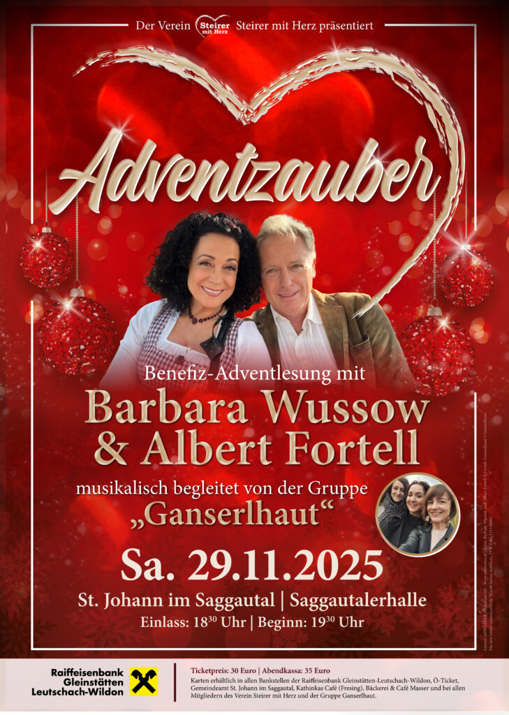 Benefiz-Adventlesung mit Barbara Wussow & Albert Fortell In Fortführung der Initiative, Menschen mit besonderen Momenten des Miteinanders zu verbinden, freut sich der Verein „Steirer mit Herz“, Ihnen eine weitere außergewöhnliche Veranstaltung präsentieren zu dürfen: Am Samstag, den 29. November 2025, ladet der Verein „Steirer mit Herz“ zu einer ganz besonderen Benefiz-Adventlesung
