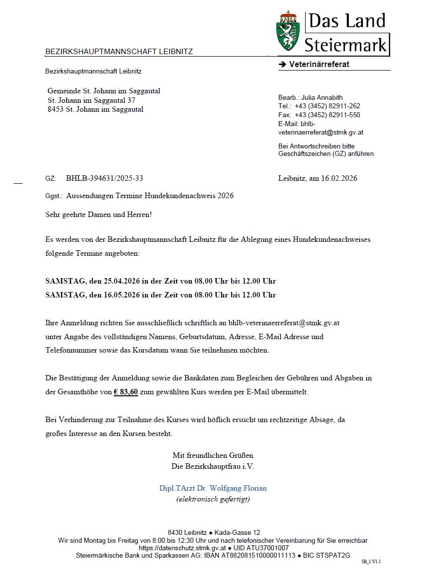 Seitens der Bezirkshauptmannschaft Leibnitz werden folgende Termine angeboten: