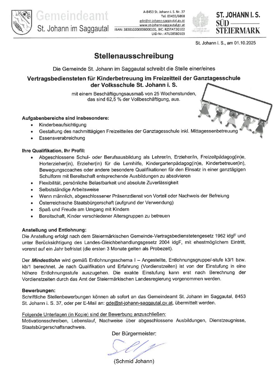 Stellenausschreibung - Vertragsbedienstete(r) für Kinderbetreuung im Freizeitteil der GTS der Volksschule